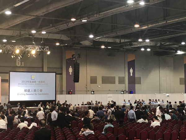 【香港商報網訊】記者馮煒強報道:區議會選舉候選人簡介會昨晚8時在亞洲國際博覽館舉行,惟在反對派參選人及助選團隊故意搗亂及叫囂情況下,舉行了不足半小時後,選管會主席馮驊法官宣布簡介會中止。選管會事後對有關人士的行為予以強烈譴責。