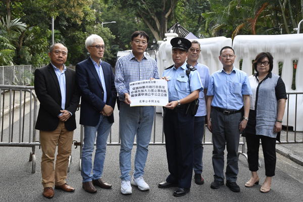 選舉公平關注組召集人王國興(左三)等昨到禮賓府請願,要求確保區議會選舉公平公正。 中通社