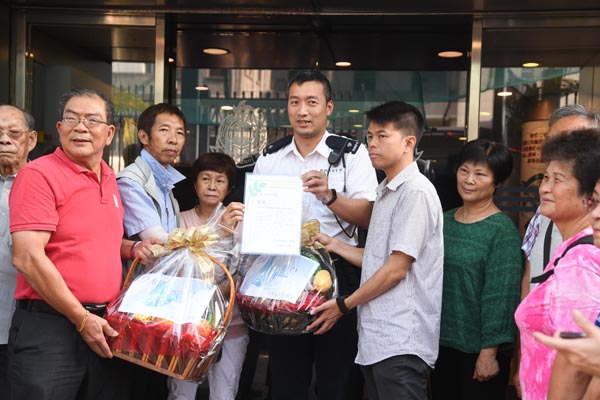 一眾南區漁民昨日下午攜帶水果及感謝信等物品,前往香港仔警署慰問警察。 記者 蔡啟文攝