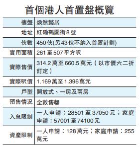 此外,煥然懿居入息及資產審查時間需時5個月,之後的首置盤應可縮短審批時間;而按揭保險樓價上限已經放寬,未來首置盤的入息限額將確保申請者在承造九成按揭情況下亦能夠負擔。