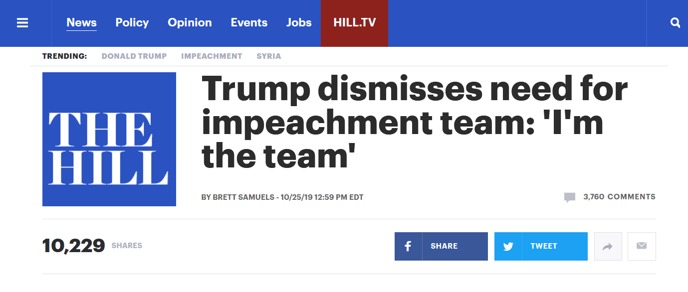 【環球網報道 記者 張曉雅】以一當十?美國眾議院發起針對總統特朗普的彈劾調查正在緊鑼密鼓的推進中,面對外界發出“總統是否需要一個團隊來應對彈劾自己調查”的疑問,特朗普25日的回答充滿了自信:我自己就是團隊。