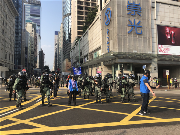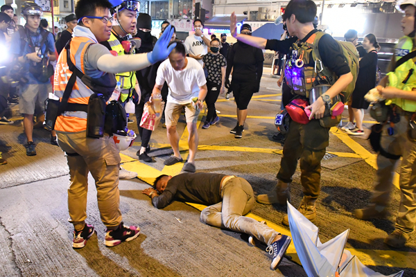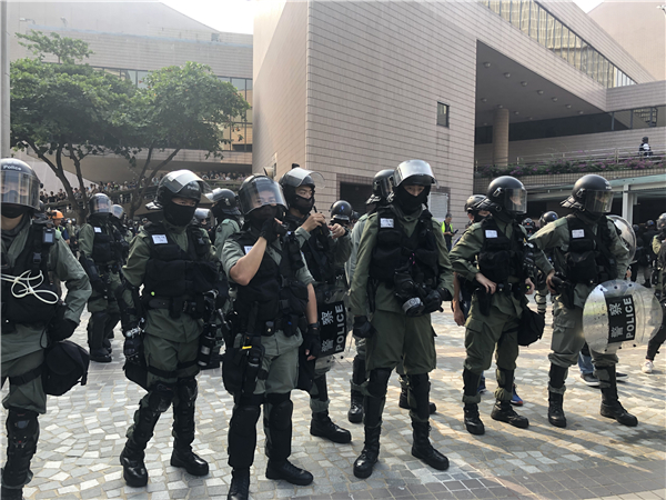 警方指,大量示威者於尖沙嘴聚集,堵塞梳士巴利道與彌敦道交界一帶道路,對交通造成嚴重影響。部分暴力示威者更用硬物及雨傘攻擊在場警員。警方多次警告暴力示威者停止違法行為無效,因應現場情況,防暴警察已施放催淚煙,使用最低所需武力驅散示威者。