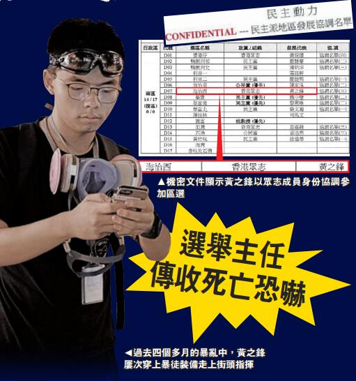 據大公報報道,參加區議會南區海怡西選舉的黃之鋒,聲稱自己獲「民主派」推薦,參選與「香港眾志」無關,但因一貫言行皆支持「自決」,昨日第三次被選舉主任查問政治主張。大公報掌握的「民主派」區選協調名單顯示,黃之鋒是以香港眾志成員身份協調出選。由2016年至今,黃之鋒一直是眾志核心人物,去年10月,他亦代表眾志表明不會改變政綱,持續以眾志秘書長身份鼓吹「不擁護基本法」的政治主張,符合被DQ條件。網傳署任南區民政事務專員暨海怡西選舉主任的蔡亮,在接手處理黃之鋒個案後即收到死亡恐嚇,需入住警方安全屋,選舉事務處和民政事務處對此不予置評。