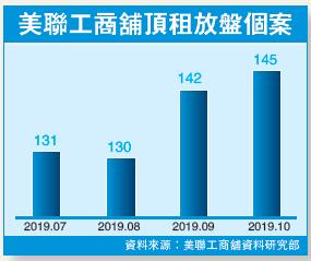 【香港商報網訊】記者邱媛媛報道:受本港政治爭端影響,零售業表現疲弱,商舖頂租放盤個案有上升趨勢。美聯工商舖資料研究部及美聯旺舖資料顯示,截至本月21日,該行商舖頂租放盤個案共錄145個,較8月尾的數據增加15個,升幅為11.5%。該行認為,爭端若仍不平息,料將繼續影響零售業,尤以飲食業最為嚴重,預料未來數月放頂租個案將持續上升。