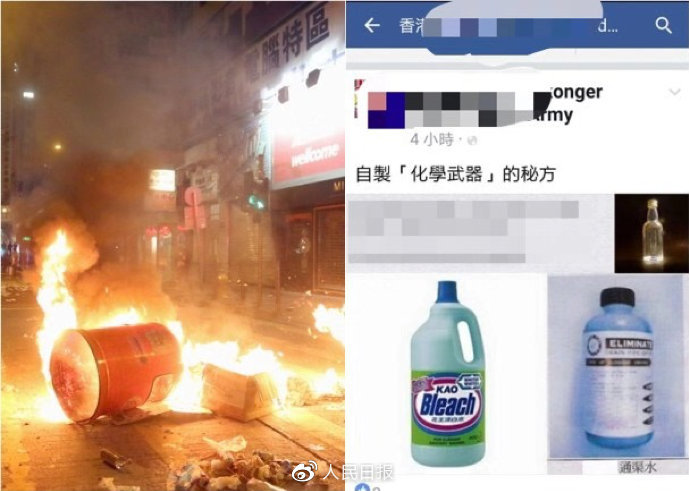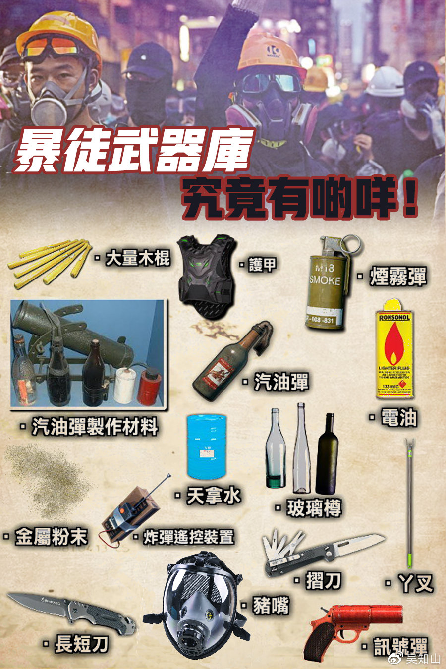 看看暴徒的“武器譜”。汽油彈、通渠水水槍(腐蝕性武器)、簡易炸彈、弓箭、改裝彈弓、自制煙霧彈、自制火焰發射器、磚頭棍棒……化學燃爆、腐蝕性武器和純物理攻擊,不一而足。