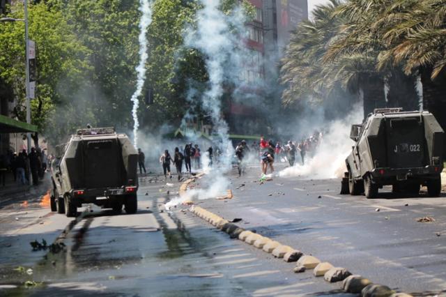 智利警察制止暴力的手段也十分強力。從流傳出的現場視頻可以看到,警方不僅動用高壓水槍車和水炮車,在馬路上邊行駛邊驅散路上的示威者,而且與很多國家警察一彈一彈發射催淚彈不同,智利警察會不停歇地向街道兩旁噴射催淚瓦斯。一旦有示威者向警察投擲石塊或硬物,警察會立即沖上前去將其制服。如果出現激烈的暴力,警察和軍人還會使用橡膠彈甚至實彈。正因為如此,在社交媒體上,智利示威者一直抗議軍方“到處在使用實彈”。