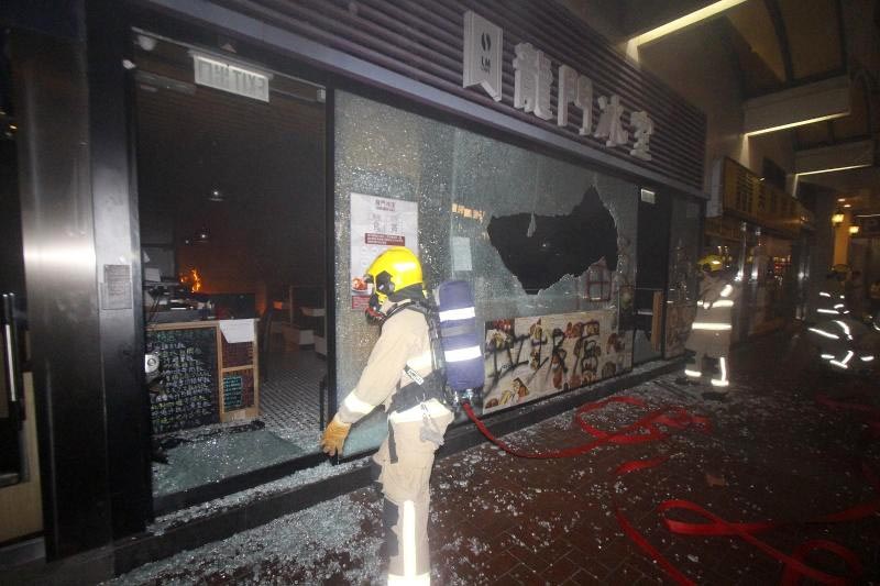 現場消息稱,昨晚10時許,大批黑衣蒙面示威者到屯門警察大興行動基地附近良德街、富臨集團旗下「龍門冰室」大肆搗亂,先將玻璃窗及門用磚頭打破,噴上粗口塗鴉,將餐廳內雜物推倒後,再投擲汽油彈縱火,其後示威者逃去,消防員接報到場救火。
