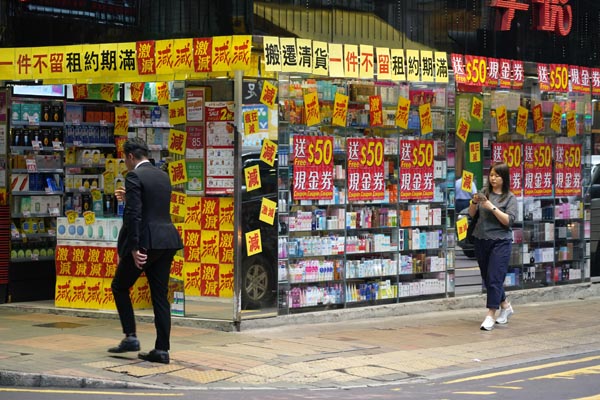 位於尖沙咀的一家零售店貼滿促銷廣告。中通社