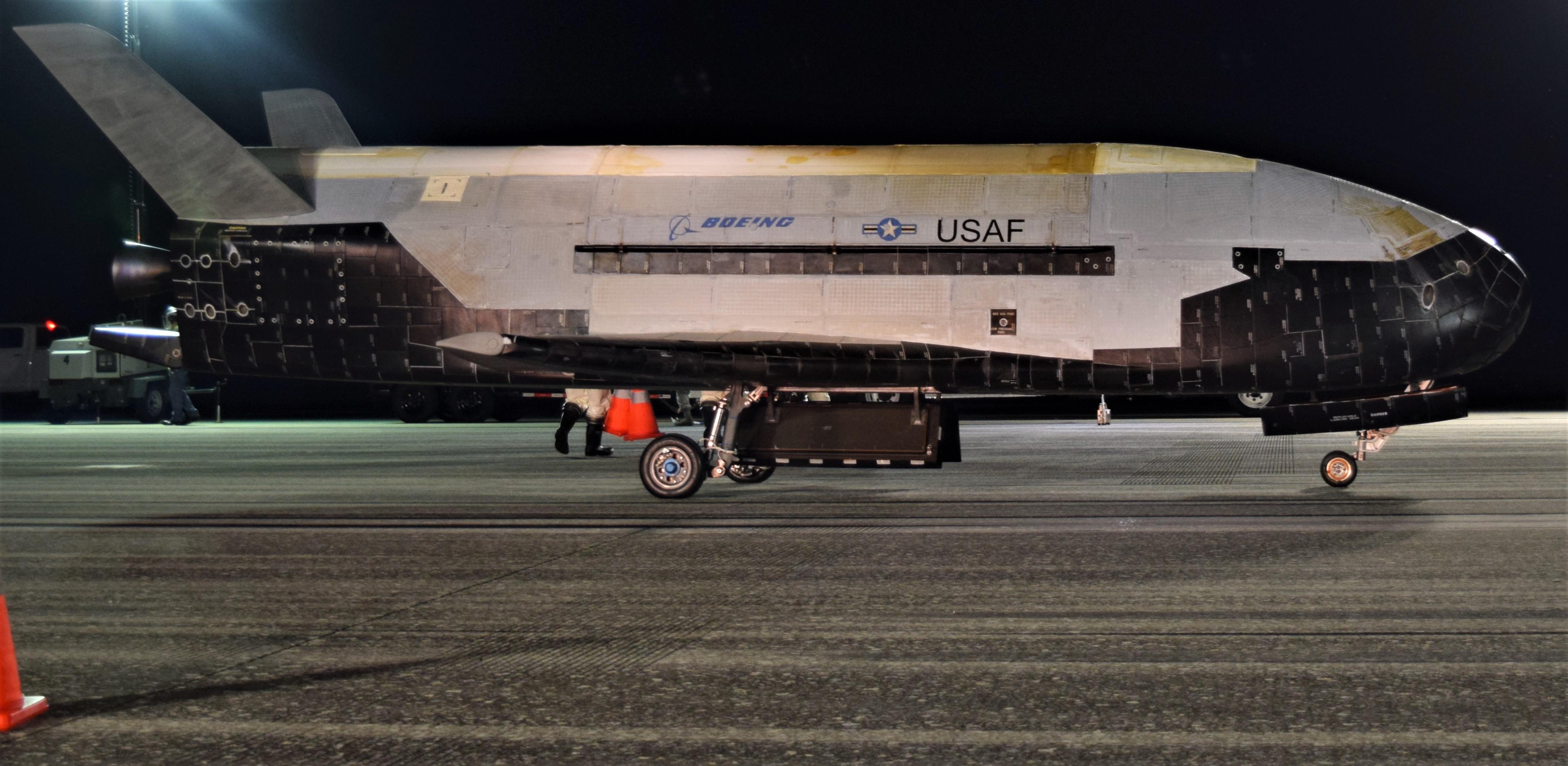 X-37B是波音製造的無人駕駛太空飛機,外形與太空穿梭機類似,但體積約為太空穿梭機的四分之一,部分電力來自太陽能。這種飛行器由火箭送入太空,返回時則像飛機那樣在跑道上滑行降落,可重複使用。