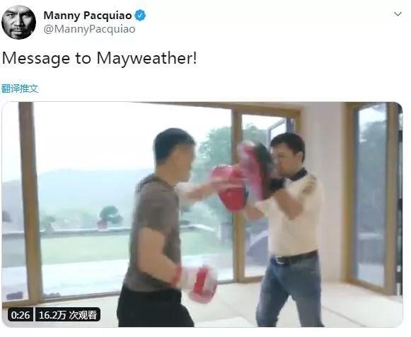 帕奎奧也喊話老對手梅威瑟稱:“如果想打一場真正的拳擊,請來找我。如果想打表演賽,我的朋友馬雲會好好照顧你的!”