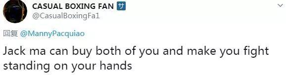 帕奎奧還調侃說,他和馬雲的組合是“真曼妮(錢)之隊”顯然是對梅威瑟的旗下的生活方式品牌“錢之隊”的一種調侃。