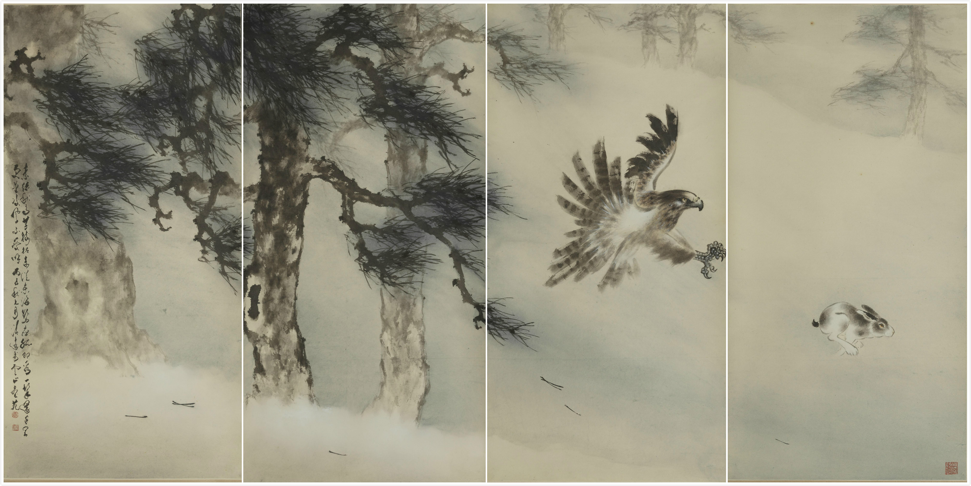 盧清遠四連屏作品《飛鷹捕兔》,1996年。