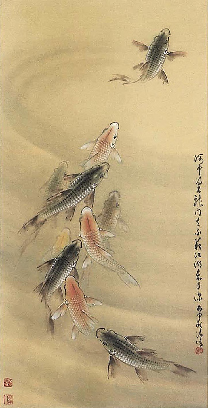若問記者現場最奪人眼目的作品是哪幅,一定是《飛鷹捕兔》。甫進展廳,一眼就能看到巨幅四連屏《飛鷹捕兔》,作為現場尺幅最大的展品,非常引人注目。畫作僅用松樹、鷹及兔子構圖,畫面右方是鷹捕捉兔子的緊張場面,視線向左移能看到松樹隨着鷹飛過,而變得飄逸,讓整個畫面鮮活起來,盧清遠解釋:「我想表達鷹追兔子的氣勢,松樹擺動的方向,無疑增加了畫作的氣氛。」能表現出如此驚心動魄的畫面,有賴於盧氏平時觀察入微,因嶺南畫派強調實物觀察、注重寫生體驗。在早年,盧氏好畫魚來寄託自己初來港的不適感,覺得魚兒悠然自得,更買來大魚缸,「當時想畫哪類魚,便會買回來飼養,再洞察它的形態、造型。」經過長時間仔細觀察魚兒的動態,就連趙少昂也認為盧氏畫魚畫得好,展品《力爭上游》描繪魚兒或在跳躍、或在游動的姿態,每條形態各異。及後移居加拿大,在廣闊的地方,才迷上蒼鷹,以表達自強不息的精神。在是次展覽中,呈現了盧氏特意為展覽繪畫一套十二生肖作品,多種動物惟肖惟妙地躍然紙上,展示其多年的繪畫功力、細緻的觀察力與靈活多變的筆墨技巧,亦可見畫藝的傳承。