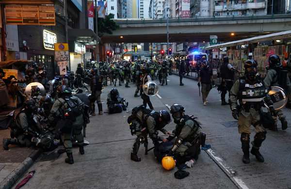 連月來,每逢節假日少數暴徒總要上街搞事。圖為防暴警察驅散並拘捕示威者。 中通社