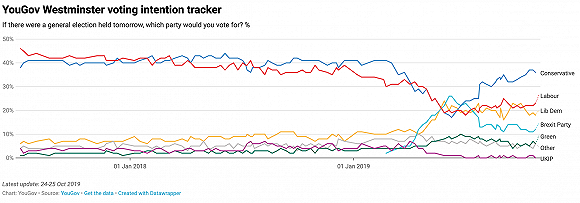 根據英國民調機構YouGov在10月底發布的數據,保守黨目前仍居各黨榜首,是最受歡迎的黨派。值得注意的是,“脫歐黨”的票倉似乎正在轉投給保守黨。保守黨在大選中極有可能以脫歐為主要競選綱領。