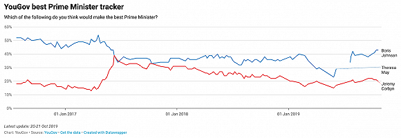 根據YouGov的另一項數據,就單個的政治家來看,約翰遜的支持率遙遙領先於其他黨派的競爭對手,目前已經超過了40%。而科爾賓的支持率則徘徊在20%左右。