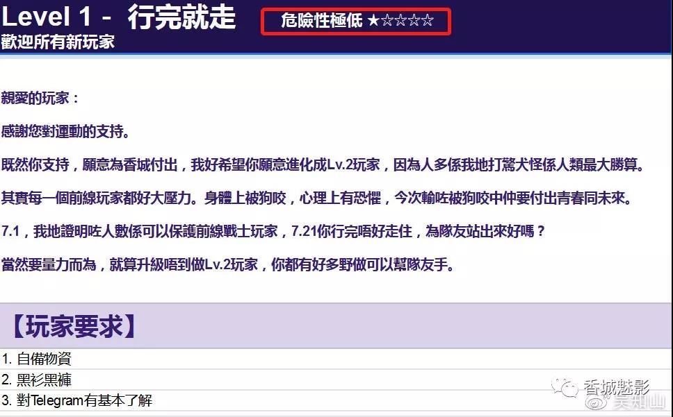 「香城Online」,顧名思義,就是一款以影射香港的虛構城市「香城」為地圖的「網遊」,玩法是「跟隨隊伍在不反對時間內遊行,再自由活動去爬山,沿途有不同怪獸需要打,守衛我城」,其實就是手把手教暴徒如何喬扮偽裝、暴力襲警、打砸搶燒、然後逃之夭夭。儘管是虛構遊戲,「香城Online」的攻略可一點都不含糊,地圖(交通路線)、職業(暴徒分工)、怪物(警察)、裝備(防具、工具及藥品)等介紹一應具全,而且「可操作性」極強,「包教包會」,能在最短時間內「批量生產」黑衣人。