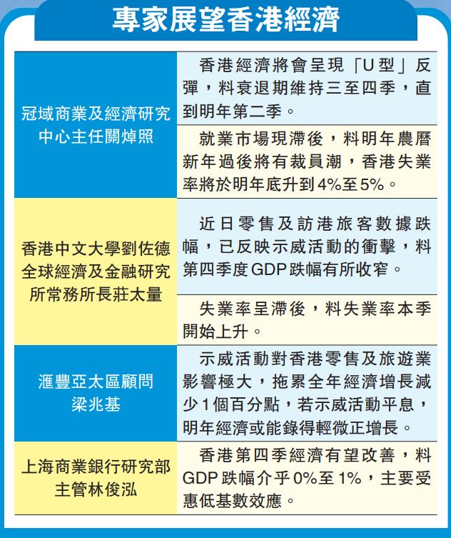 經歷GDP連續兩季負增長後,香港經濟陷入衰退已成不爭事實。究竟今次衰退期維持多久?未來將以何種形式反彈?冠域商業及經濟研究中心主任關焯照接受本報訪問時稱,即使香港經濟見底,但也頂多只會出現「U型」反彈,關焯照稱:「與2003『沙士』後不同,今次中央難以『送大禮』刺激香港經濟,加上受制中美貿易戰以及環球衰退牽制,按一般衰退介乎三至四季度計,除非示威活動短期內完結,否則要待明年第二季才有望見底。」