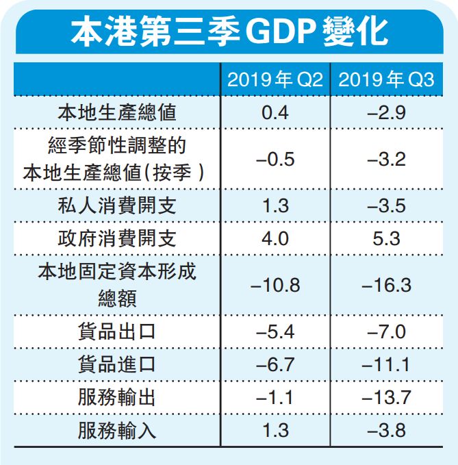 政府發言人稱,香港內部需求明顯轉差,經濟下滑削弱消費情緒;連串大型示威活動對零售、飲食和其他消費相關行業造成重大干擾,拖累私人消費開支按年下跌,為逾10年來首次;由於經濟信心低迷,導致整體投資開支的跌勢加劇。是次為預估數據,經修訂後數據,以及最新全年經濟增長修訂預測,將一併於11月15日公布。