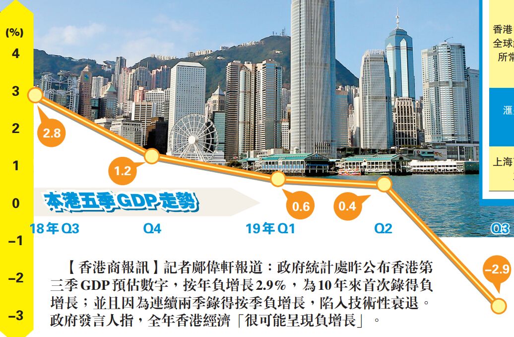 【香港商報网訊】記者鄺偉軒報道:政府統計處昨公布香港第三季GDP預估數字,按年負增長2.9%,為10年來首次錄得負增長;並且因為連續兩季錄得按季負增長,陷入技術性衰退。政府發言人指,全年香港經濟「很可能呈現負增長」。