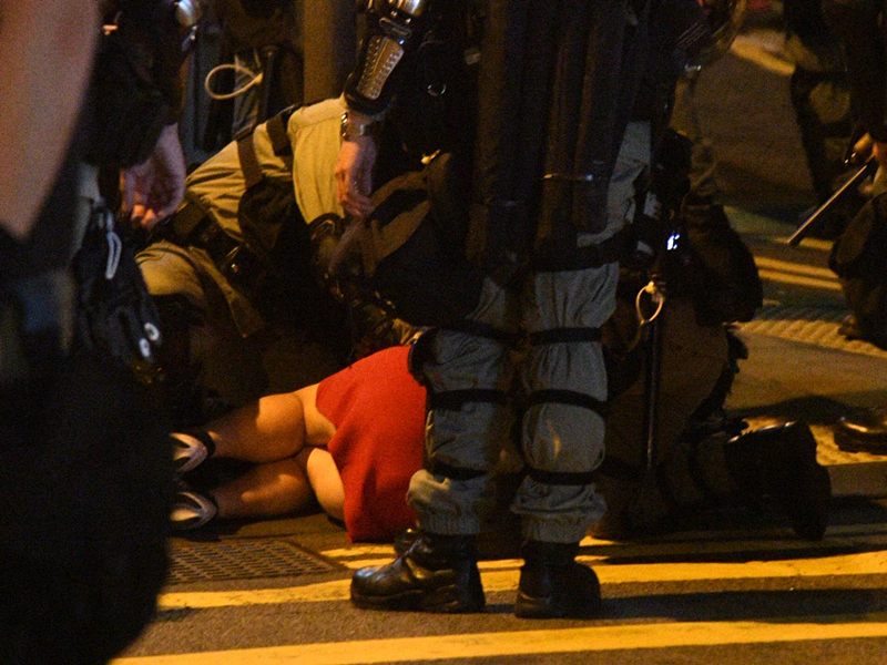 一名紅衣女於衝突中被捕。 記者 蔡啟文攝