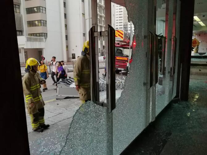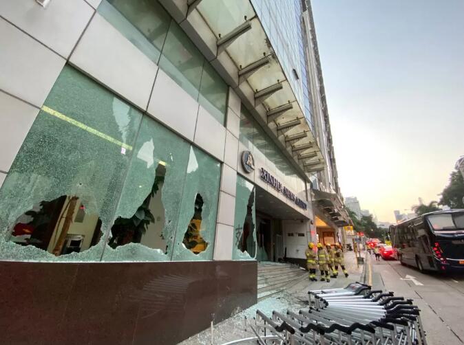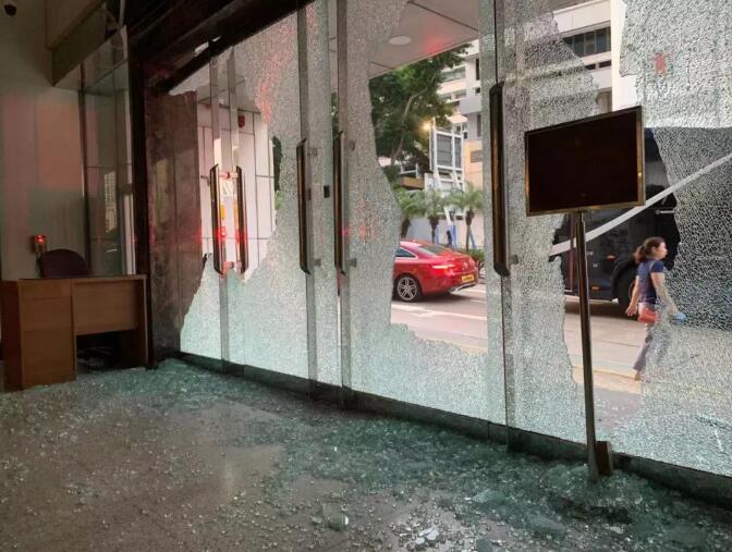 在持续约十分钟的打砸破坏中,暴徒破坏大楼门口安防设施,在大楼正门玻璃墙及外墙上喷涂侮辱性字句,砸毁大楼玻璃大门及玻璃墙,大楼二层及三层的部分窗户也被砸坏。暴徒还向办公大楼大堂投掷燃烧弹及油漆弹,并一度进入大楼大堂进行破坏。还有暴徒在大楼正门门口纵火。
