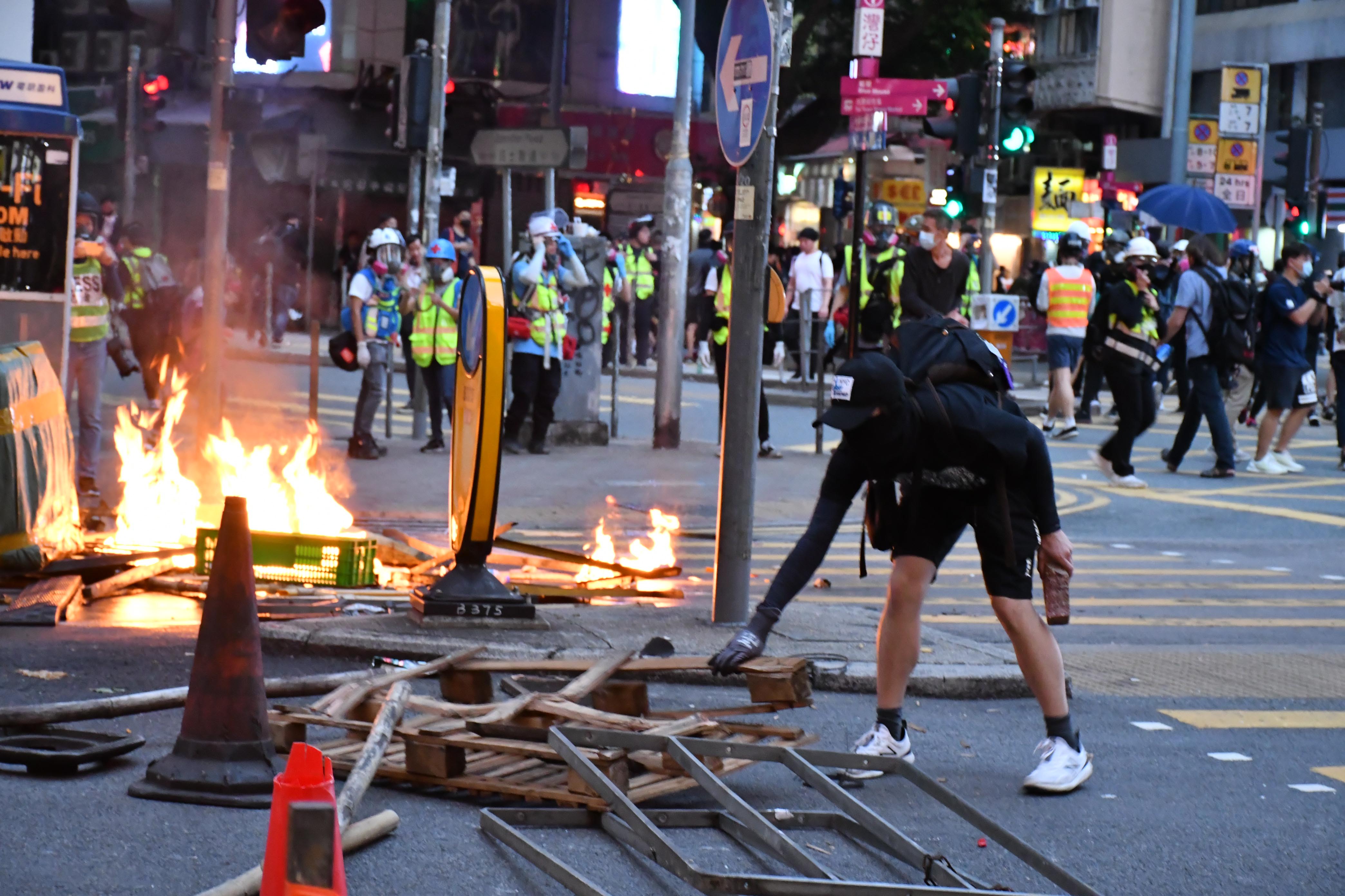 港島非法集會又淪為暴亂,暴徒肆意縱火、堵塞道路,警方全力止暴制亂。 記者 馮瀚文攝