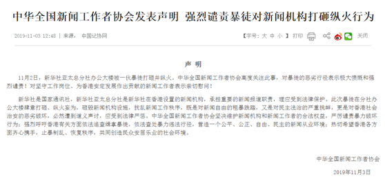 新华社是国家通讯社,新华社亚太总分社是新华社在香港设置的新闻机构,承担重要的新闻报道职责,理应受到法律保护。此次暴徒在分社办公大楼肆意打砸、纵火妄为,砸毁新闻机构设施,扰乱新闻工作秩序,既是对新闻自由的粗暴践踏,又是对民主法治的严重挑衅,更是对香港社会治安的恶劣破坏,必然遭到道义声讨,应受到法律严惩。中华全国新闻工作者协会坚决维护新闻机构和新闻工作者的合法权益,严厉谴责暴力破坏行为;强烈呼吁香港有关方面依法追查缉拿暴徒,依法查处暴力违法行径,营造一个公平、公正、自由、民主的新闻从业环境;热切希望香港各方面齐心携手,止暴制乱、恢复秩序,共同创造民众安居乐业的社会环境。