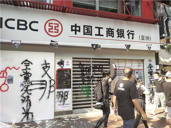 中国工商银行被暴徒塗鴉破壞嚴重。
