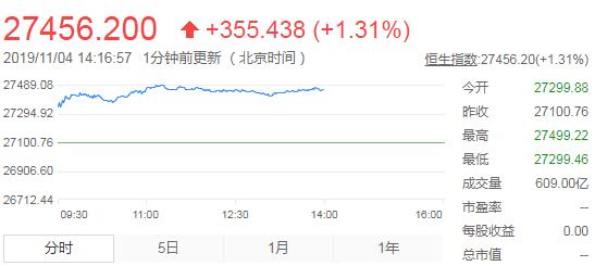 11月4日消息,美股周五收高,道指上涨300点,纳指与标普500指数创历史最高收盘纪录。美10月非农就业人数增加12.8万超出预期,失业率为3.6%仍处在50年来的最低水平。市场仍关注国际贸易关系的进展与美企财报。今日开盘,港股恒指高开0.73%,随后涨超1%。截至发稿时止,恒生指数涨1.31%,报27456.24点。