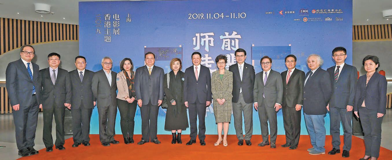 行政長官林鄭月娥(右七)、上海市市長應勇(中)、商務及經濟發展局局長邱騰華(右六)、上海市電影局局長胡勁軍(左三)及香港電影發展局主席王英偉博士(右五)在開幕禮上合照。