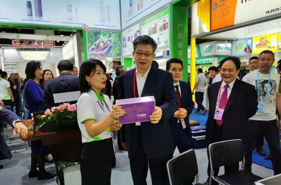 广交会展位上羊城人与上级领导和海内外客户共同为“羊城牌”倾心健康60年点赞。