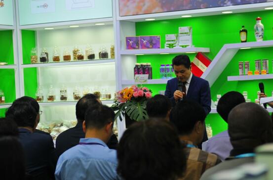 业务经理向商务部市场运行和消费促进司二级巡视员陈平介绍蛹虫草胶原蛋白肽新产品。