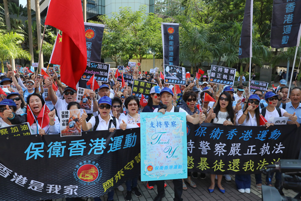 【香港商報網訊】記者馮仁樂報道:暴力衝突未見平息,警察每日疲於奔命,團體「保衛香港運動」發起撐警遊行,獲逾1000名市民參與。市民揮舞國旗區旗,高聲為警隊打氣,支持警察嚴正執法,恢復社會秩序;同時又譴責暴徒以暴力擾亂社會安寧。團體希望以實際行動支持警察,藉着出聲譴責暴力和遊行,表達香港市民與警察同行,一同為香港止暴制亂。