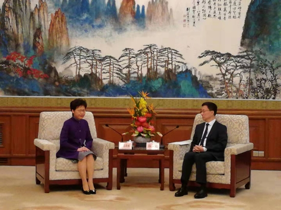 中共中央政治局常委、國務院副總理韓正今日上午在北京會見香港特別行政區行政長官林鄭月娥。