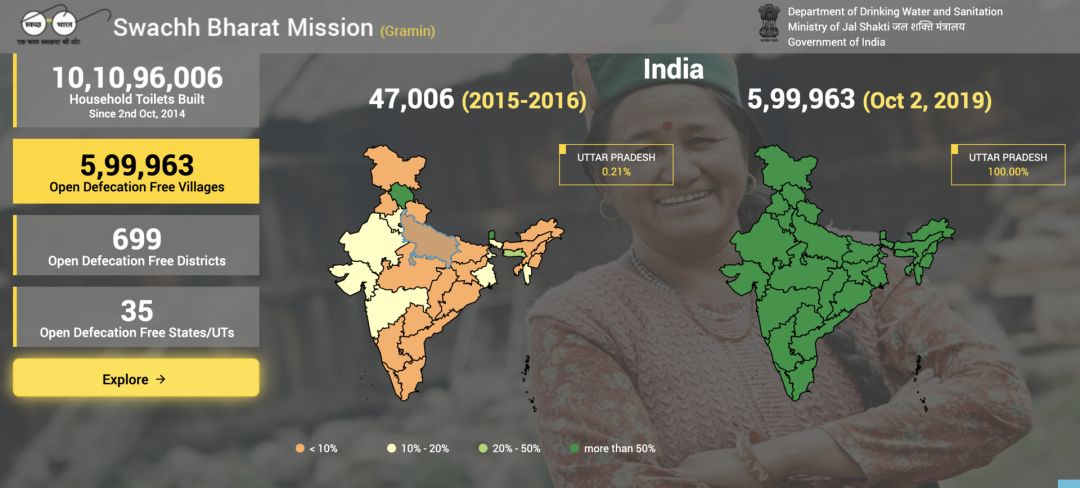 在如此强力的推动下,厕所的数量确实直线上升,随着1.1亿间厕所相继落成,政府数据显示,印度已经实现了家用厕所的100%覆盖。