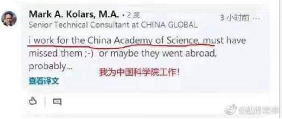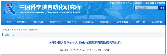 中国科学院自动化所研究所网站11月5日发布消息称,近日,网上出现“外籍人员Mark A. Kolars在社交平台发表不当言论”的相关信息。11月5日获知此事后,研究所领导高度重视,立即成立调查小组对相关情况开展调查。