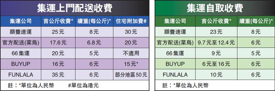 綜觀多間集運公司,上門配送以66集運及BUYUP的運費較便宜。66集運的計算方法是貨品越重,運費則愈低,例如貨品重量介乎101至500公斤,首公斤僅為5元(人民幣,下同),續重也是每公斤5元。至於貨品重量介乎1至100公斤,首公斤達20元,續重是5元,兩者均須附加費。BUYUP的計算則是無論任何重量,上門配送的運費是首公斤為16元,續重則須6元。因此,如果選購較重的貨品,可考慮用66集運。