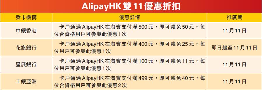 每年11月11日都是淘寶大型購物狂歡節,除有商戶優惠外,付款方法上也可享額外折扣,如AlipayHK就與多間銀行合作推出信用卡消費優惠。