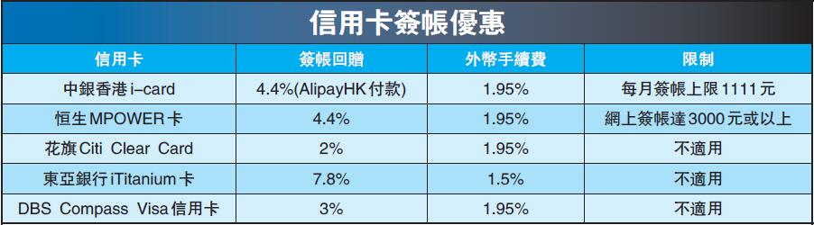 至於選擇信用卡直接付款,則要留意信用卡提供的網購優惠,折完再賺回贈以慳得最多。部分信用卡因應個別網購平台而提供回贈,如恒生MPOWER卡及DBSCompassVisa信用卡,均為在淘寶及天貓的消費提供較高回贈。恒生MPOWER卡簽帳滿3000元或以上,可享有4.4%的回贈。DBSCompassVisa信用卡則要預先登記,在登記月份的首1000元簽帳,可享有額外回贈。