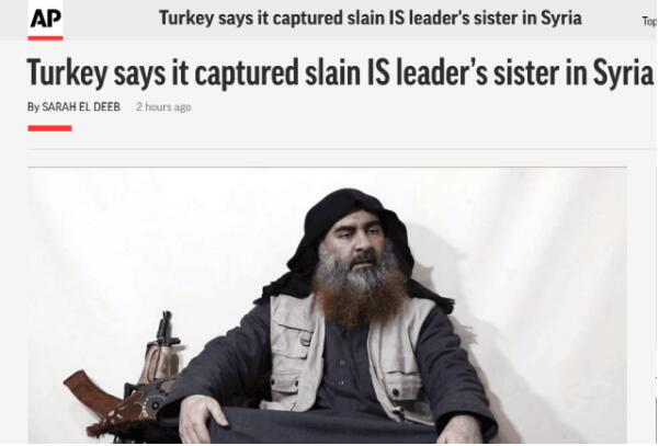 美国10月27日宣布极端组织“伊斯兰国”(IS)最高头目巴格达迪被已在美军突袭行动中毙命。11月4日,土耳其官员表示,其在叙利亚一次行动中逮捕了巴格达迪的姐姐拉斯米亚阿瓦德和她的丈夫。根据该高官描述,土耳其方面将阿瓦德比作“情报金矿”,“她(阿瓦德)所知道的可以极大地增加我们对这个组织的了解,帮助我们抓住更多的坏人。”
