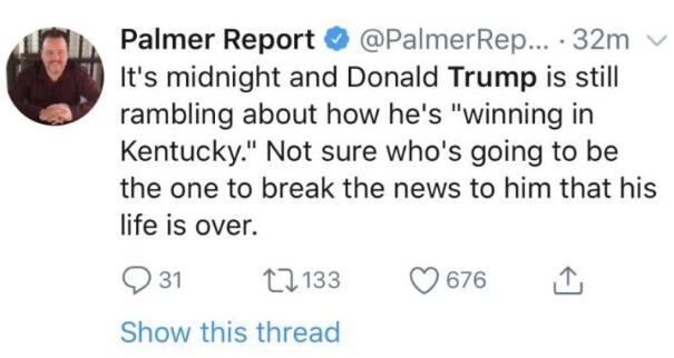 美国政治言论博主Palmer Report发推说:“现在是午夜,特朗普还在喋喋不休地谈论他是如何‘赢得肯塔基州’的。不知道有谁能告诉他,他的政治生涯快要结束了。”