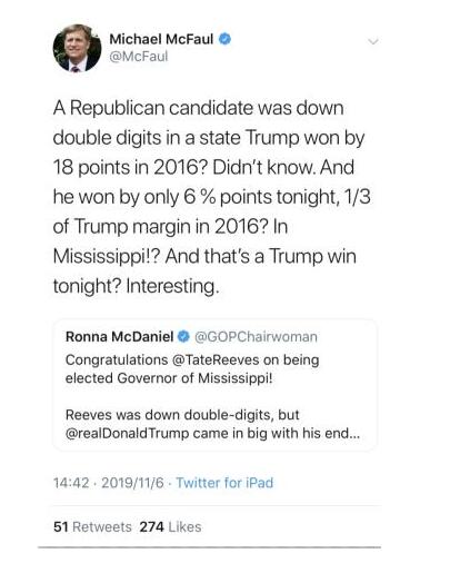 斯坦福大学政治学教授McFaul在推特上表示:“相比2016年特朗普18个百分点的获胜优势,共和党候选人的州支持率下降了两位数。今晚他以6%的优势获胜,仅是2016年特朗普优势的三分之一。在密西西比!? 这就是今晚特朗普的胜利?有趣。”
