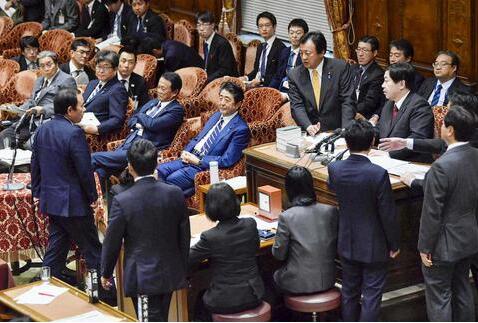 多名在野党议员起身要求安倍道歉(共同通信社)