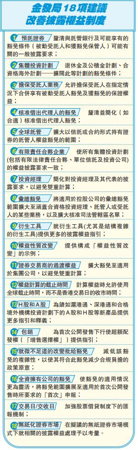 為了長期更有效的監管,報告提出共18項建議,期望改善披露權益制度的同時,亦不削弱市場透明度。建議涉及包括預託證券、集體投資計劃、擔保受託人業務、核准借出代理人的豁免、全球託管、有限責任合夥企業,以及衍生工具等範疇。