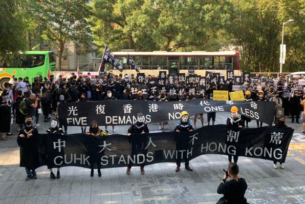 【香港商报网訊】香港中文大學今日舉辦第87屆頒授學位典禮,約百名應屆畢業生9時發起校內遊行,身穿畢業袍、戴上口罩,由大學站民主女神像遊行至舉辦典禮的林蔭大道烽火台,亦有人揮舞美國國旗。校方宣佈提前結束畢業禮,校長段崇智在保安護送下離開。