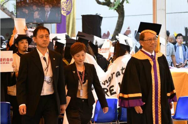 这些學生在港鐵大學站集合,遊行至校內「烽火台」,部分人戴上口罩,沿途展示示威橫額,揮舞美國國旗。典禮進行奏唱國歌環節,有畢業生背向主禮台,並高叫口號。畢業典禮僅持續半小時,校方表示,因特殊情況,典禮程序有變,提早結束典禮,校長段崇智其後在保安護送下離開。