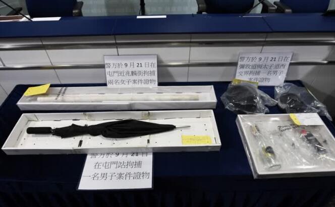 警方曾展示在暴力示威活動中檢獲經過改裝的雨傘。中新社