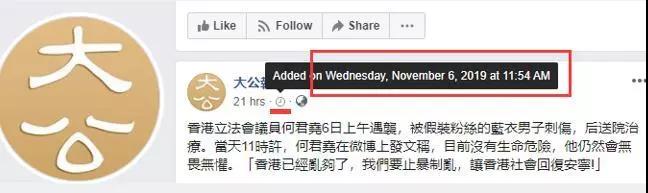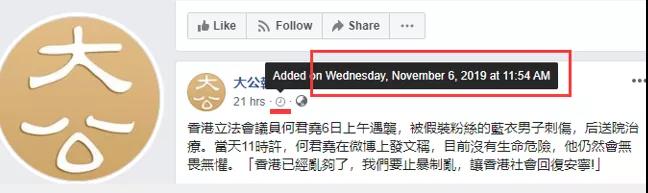 我们的首要依据是,在《大公报》遭到围攻的那个看似是何君尧遇刺前一天发布的帖子上,我们通过核实发现了一个“时钟”一样的小标签,而当我们把鼠标移动到这个小标签上时,一段这样的文字就出现了:“(帖子)添加于2019年11月6日周三上午11:54”。