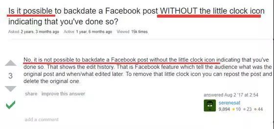 这一情况其实很早之前就有不少国外的脸谱网用户确认过,即你只要修改过帖子的发布时间,帖子上就会不可避免地出现一个“时钟标签”,显示帖子的原始发布日期。